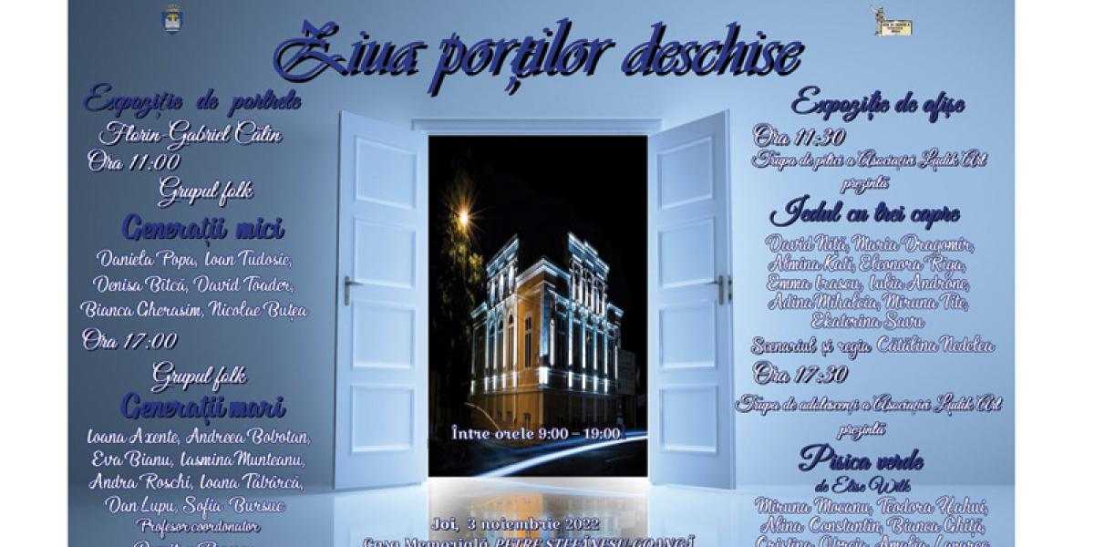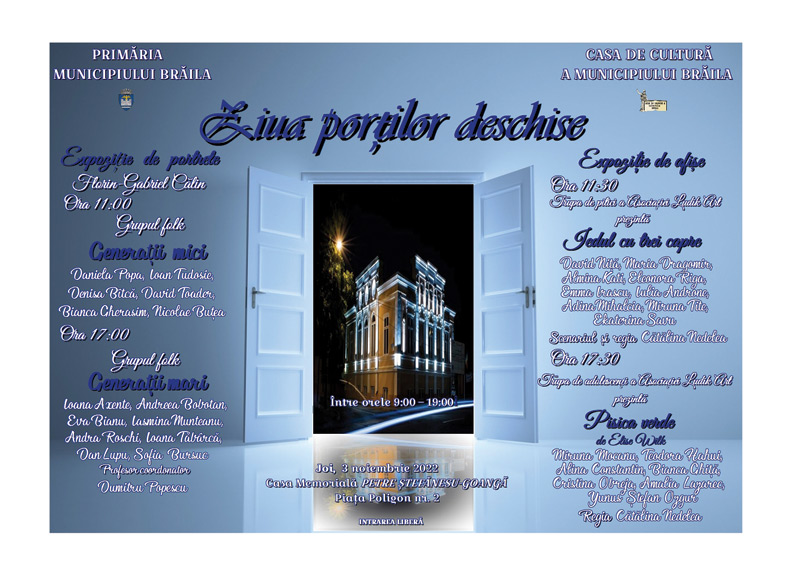 Casa de Cultură a Municipiului Brăila organizează joi, 3 noiembrie 2022, la sediul său din Piața Poligon nr. 2, "Ziua Porților Deschise", care va include o serie de evenimente a căror menire este să facă cunoscută publicului activitatea instituției.