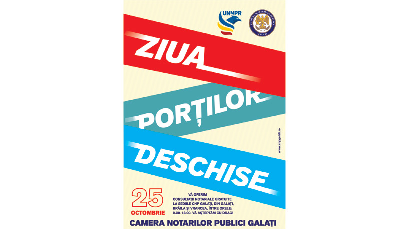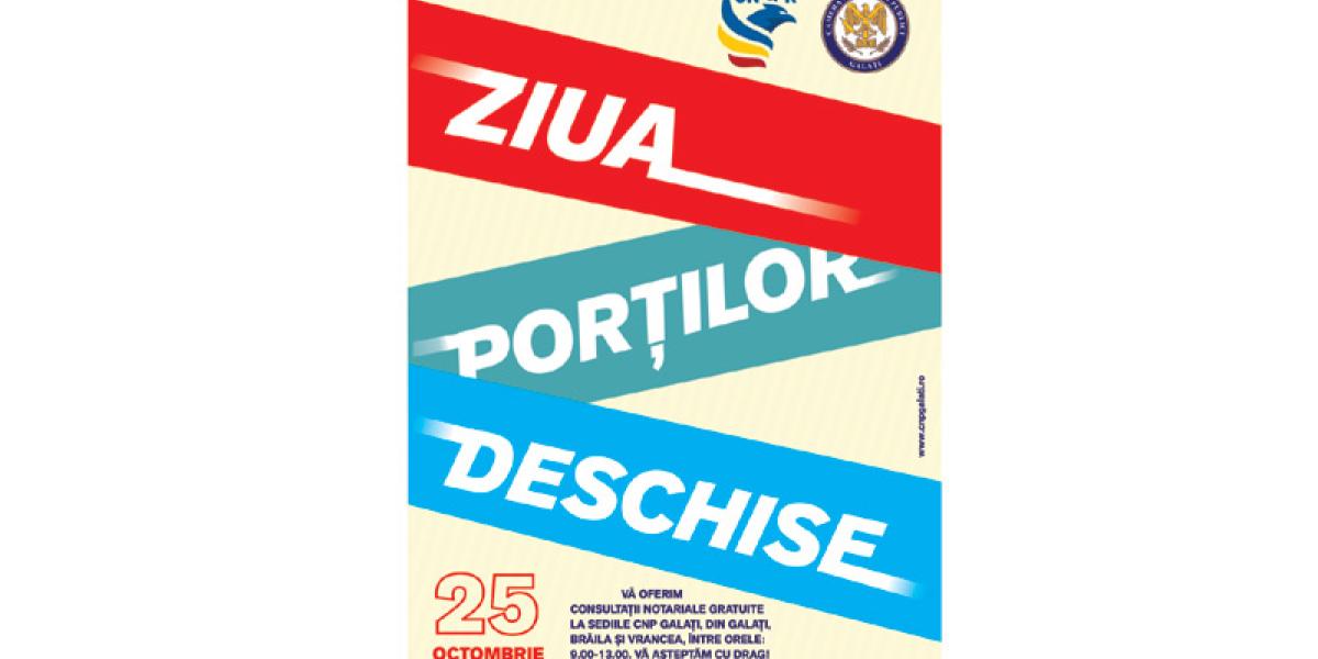 Cu prilejul „ZILEI PORȚILOR DESCHISE”, notarii publici din judeţele: Galaţi, Brăila şi Vrancea oferă cetățenilor consultații notariale pro bono pe teme de larg interes, în locații desemnate sau prin telefon, email și online.