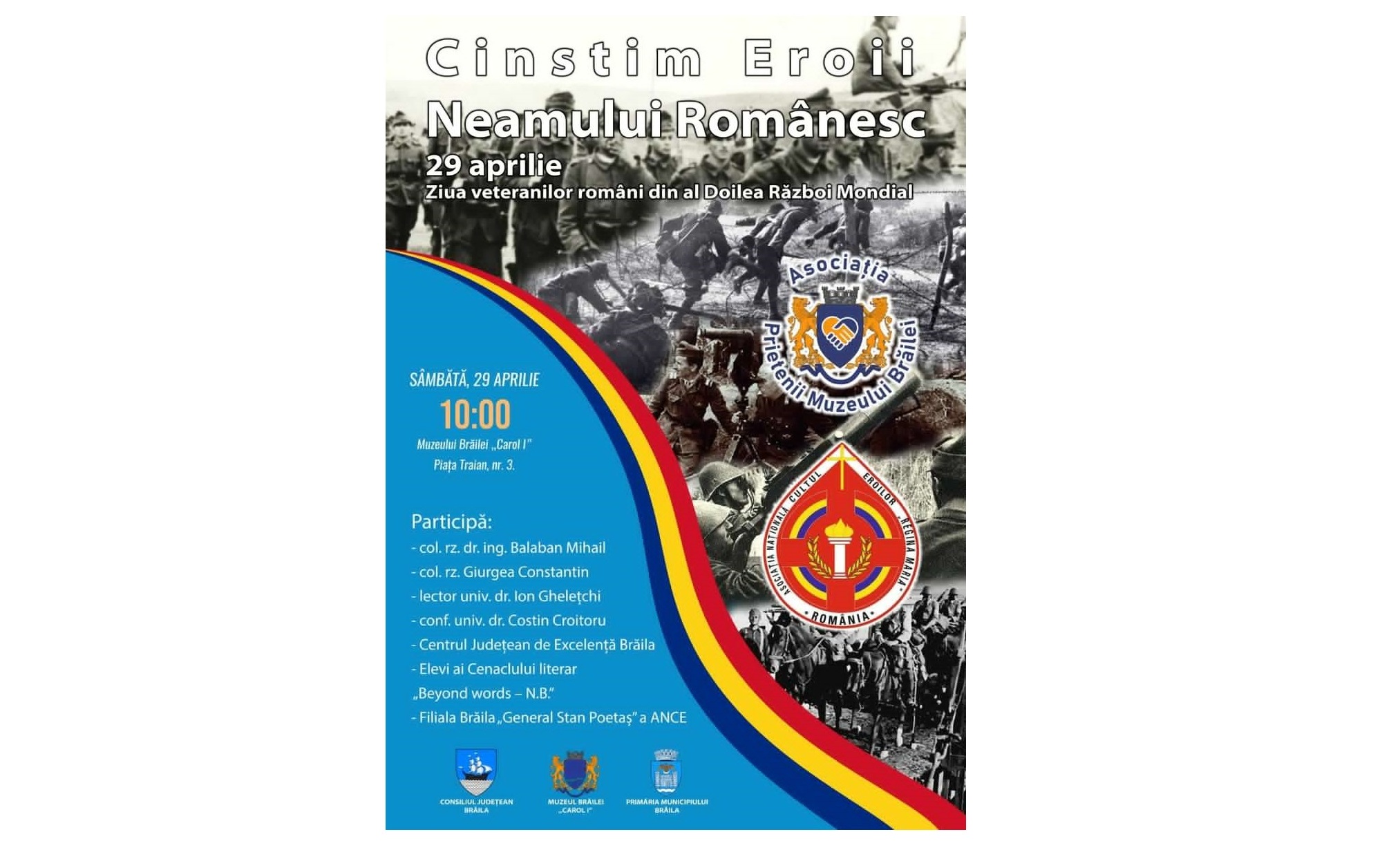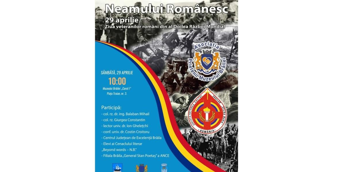 Sub genericul „Cinstim Eroii Neamului Românesc”, în Sala „Regele Ferdinand I și Regina Maria” a Muzeului Brăilei „Carol I” (Piața Traian nr. 3), în ziua de sâmbătă, 29 aprilie, de la ora 10.00, va fi marcată Ziua Veteranilor Români din Al Doilea Război Mondial.